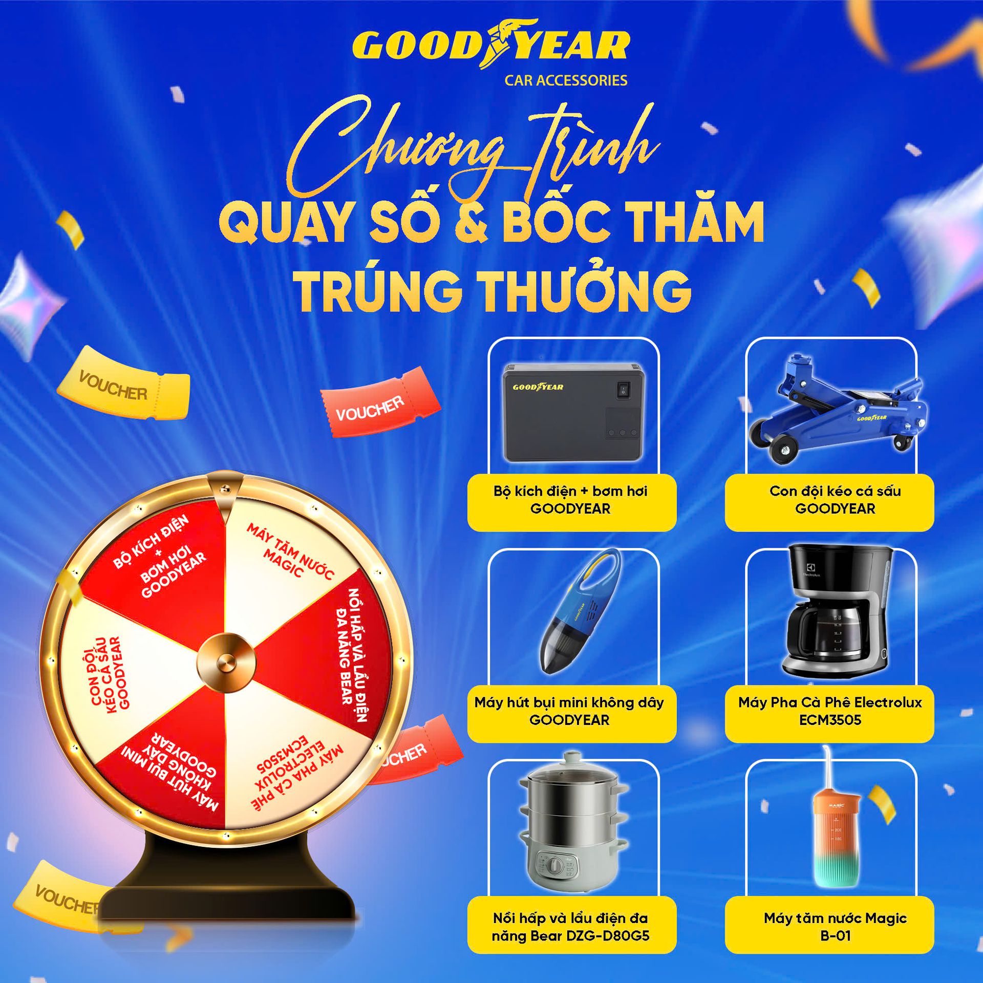 Bốc thăm trúng thưởng sẽ được áp dụng cho toàn bộ sản phẩm GOODYEAR trong thời gian diễn ra sự kiện và chương trình khuyến mãi